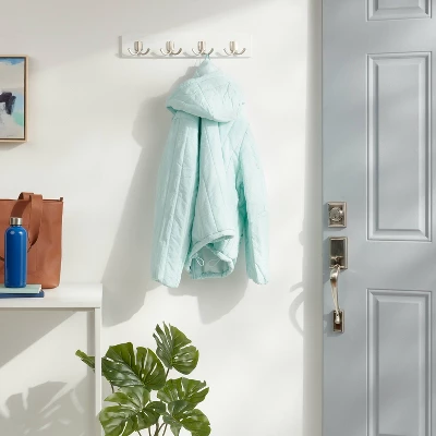 Keep all your frequently used items in one easy-to-find place with this Modern Octopus 4 Hook Rail with Nickel Hooks from Brightroom™. This decorative hook rail features a clean modern design. It showcases a flat white base that has four nickel-plated dual hook points for hanging hats, coats, jackets, belts or other items. Just wall mount it in your laundry room, bathroom, entryway or kitchen to maximize storage space.